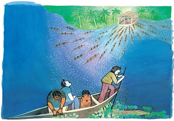 (...) Saí dali e fui comer um pacu assado de brasa em sua homenagem. Botei bastante pimenta murupi e tomei um suco de taperebá pra aliviar o peito. No dia seguinte, logo cedo pela manhã, papai atravessou o rio da vida.(...)