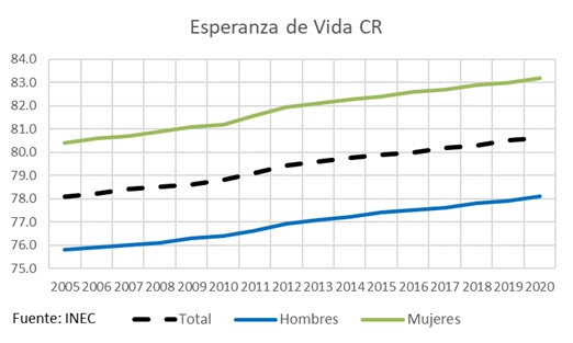 3/ Que los jubilados vivan más años = mayor presión para los cotizantes. En CR la expectativa vida ha subido de 75.8 hombres / 80.4 mujeres en 2005 a 78.1 hombres / 83.2 mujeres en 2020. Esto equivale a ≈28 pagos de pensiones adicionales a hombres y 34 a mujeres.