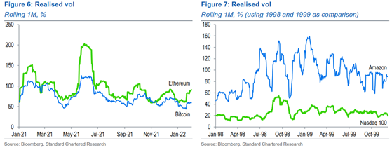 3/In volatility, ETH similar to Amazon. In 1998-99, 1month AMZN vol = 94. In 2021 ETH 1M vol = 97. In relative size, AMZN≈1% of Nasdaq in 1999, ETH≈2% of Nasdaq today. After ATH in Jan99, AMZN fell 57% by Feb. Then ATH Apr99 before losing 62%. New ATH Dec99. Sound familiar?