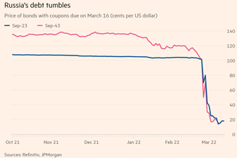 2/ Russia is due to make 2 interest payments ($117m) on USD bonds on Wednesday. There is a 30-day grace period in which to pay, if it doesn't -> constitute a default. Markets priced in a default, bonds trade at 20% face value and Credit rating agencies have assigned junk rating