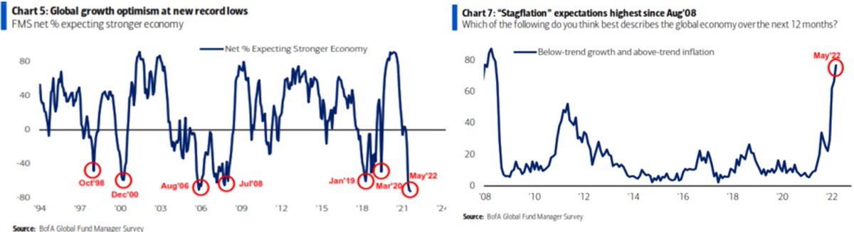 Extremely bearish @BankofAmerica May Global Fund Manager Survey. Here are key take aways: 1. On risk -> #1 tail risk are hawkish central banks, #2 recession; risks from inflation and Russia/Ukraine drop; cash levels surge to 6.1% from 5.5% (20-year high).