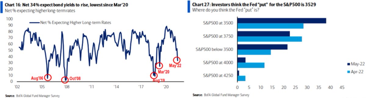 3. On rates: 68% expect inflation rates to drop coming quarters, fewer (net 34%) expect bond yields to rise, but 78% expect short rates to rise; Fed "put" is 3529 on S&P500 (-12% from current levels)
