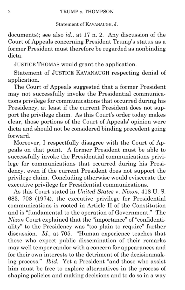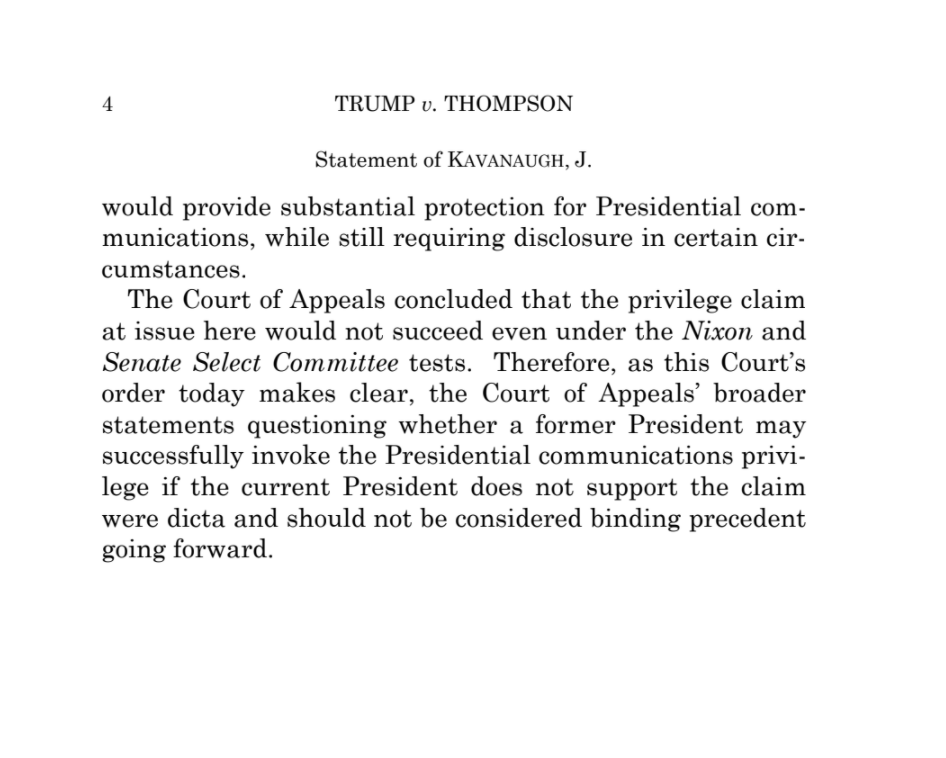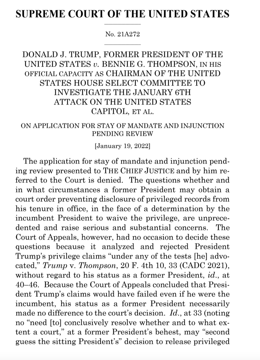 This is a thorough rebuke. The Court does not even get into the "serious and substantial" question of whether former presents can assert executive privilege over records, because Trump loses ANYWAY. He'd have to turn over these records EVEN IF HE WERE STILL THE PRESIDENT.