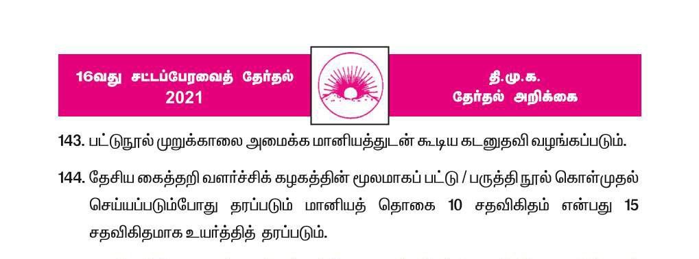 தேர்தல் அறிக்கையில் (144) அளித்த வாக்குறுதியின்படி பருத்தி/பட்டு நூல் மானியம் 15% ஆக உயர்த்த இதுவரை எந்த நடவடிக்கையும் எடுக்கவில்லை 4/