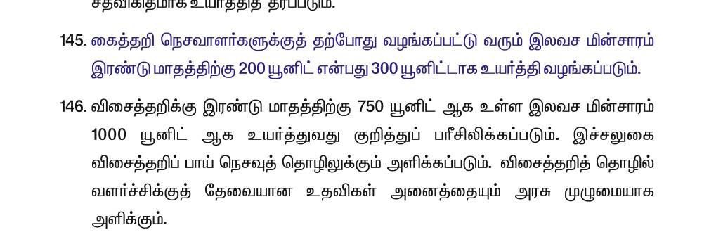 146. விசைத்தறிகளுக்கு தேர்தல் அறிக்கையில் உள்ளபடி இரண்டு மாதத்திற்கு ஆயிரம் யுனிட் இலவச மின்சாரம் வழங்க வேண்டும்