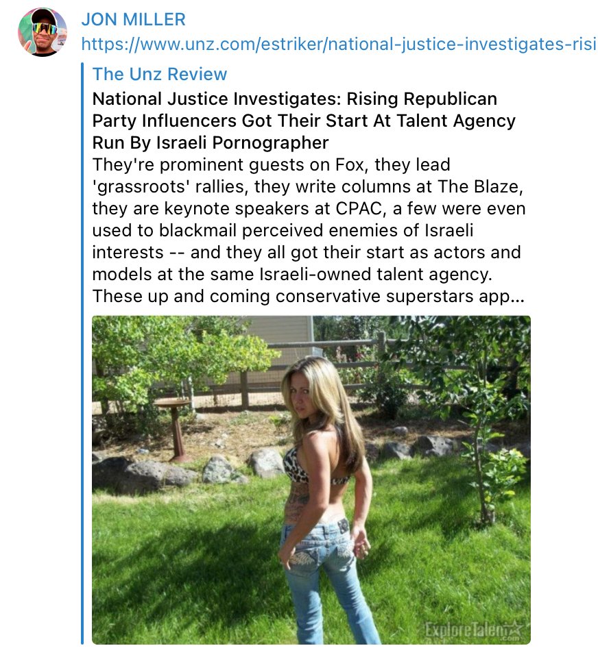 Here's Miller citing "uncomfortable truths about Jewish power, influence [&] money", claiming that he uncovered the truth that Jews "run everything" at a dinner party, & insinuating that the social media site GETTR (which groypers despise) is run by Jews