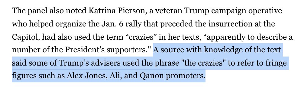 5) Katrina Pierson described some people in Trump's orbit as "crazies", per texts given to the committee. A source familiar with the texts said Trump allies often used the phrase to describe Alex Jones, Ali Alexander and QAnon backers. politico.com/news/2022/01/2…