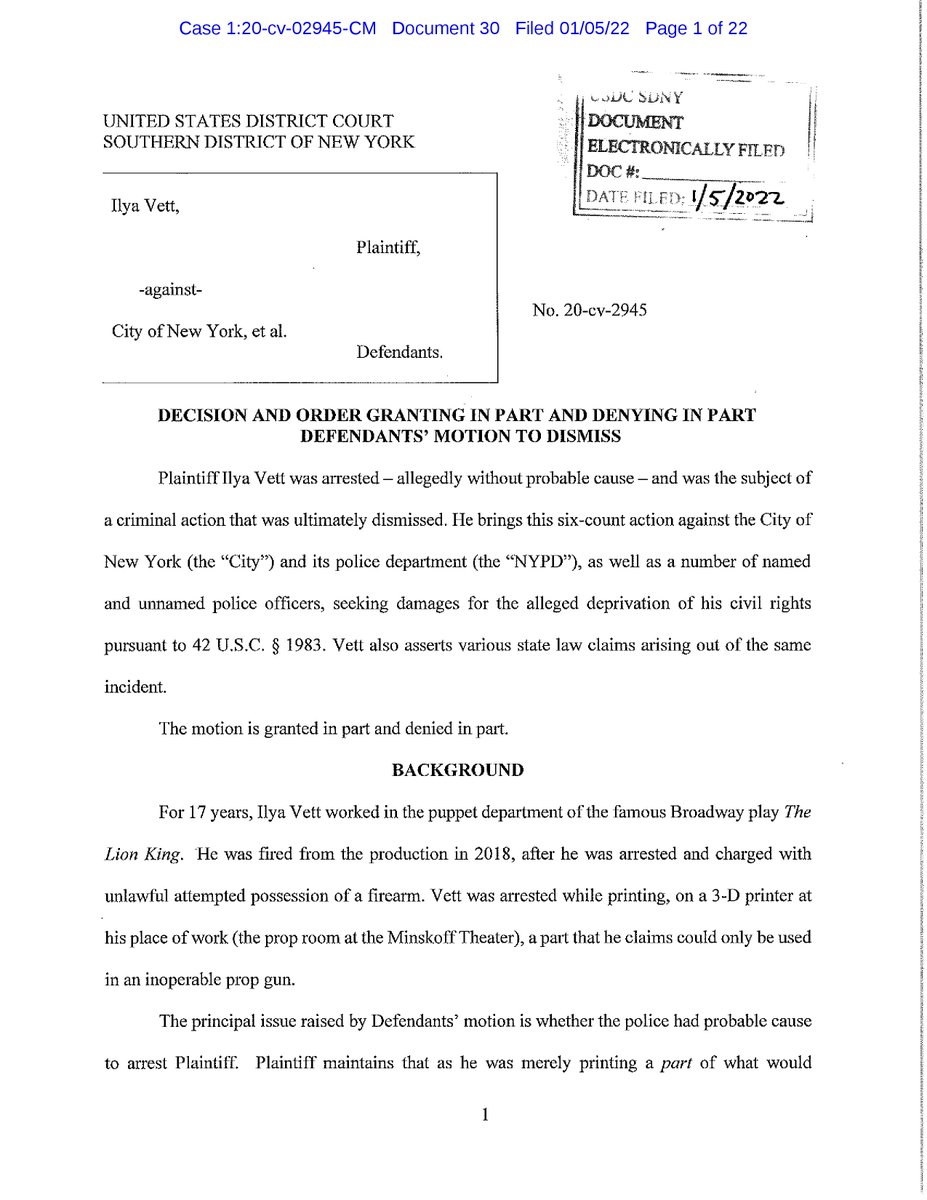 NEW: Vett v. NYC (S.D. NY): While saying it "strongly smells of what is known as 'artful pleading,'" judge rules that a former Broadway puppet maker can continue suing NYC and the officers who arrested him for allegedly 3D-printing a prop gun part. storage.courtlistener.com/recap/gov.usco…