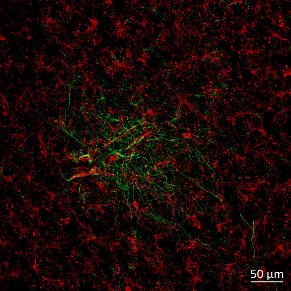 Die Fotos unten habe ich heute im Mikroskop gemacht. Ich sehe jeden Tag das Gleiche im Mikroskop. Ich kann meine Quantifizierung nicht einmal blind für die Gruppen durchführen, da die Covid-Gruppe immer offensichtlich ist. Eine „undichte Blut-Hirn-Schranke“ sieht folgendermaßen aus: wütende (aktivierte) Astrozyten ( 🟢 Gfap), die ein Blutgefäß umgeben, mit mehr Anwesenheit von aktivierten Mikroglia/Makrophagen ( 🔴 Iba1). Nicht infiziertes Tier im ersten Bild, Foto aufgenommen im piriformen Kortex (primäre Riechregion, in der Nähe von Gedächtnisbereichen wie dem Hippocampus und dem entorhinalen Kortex).
