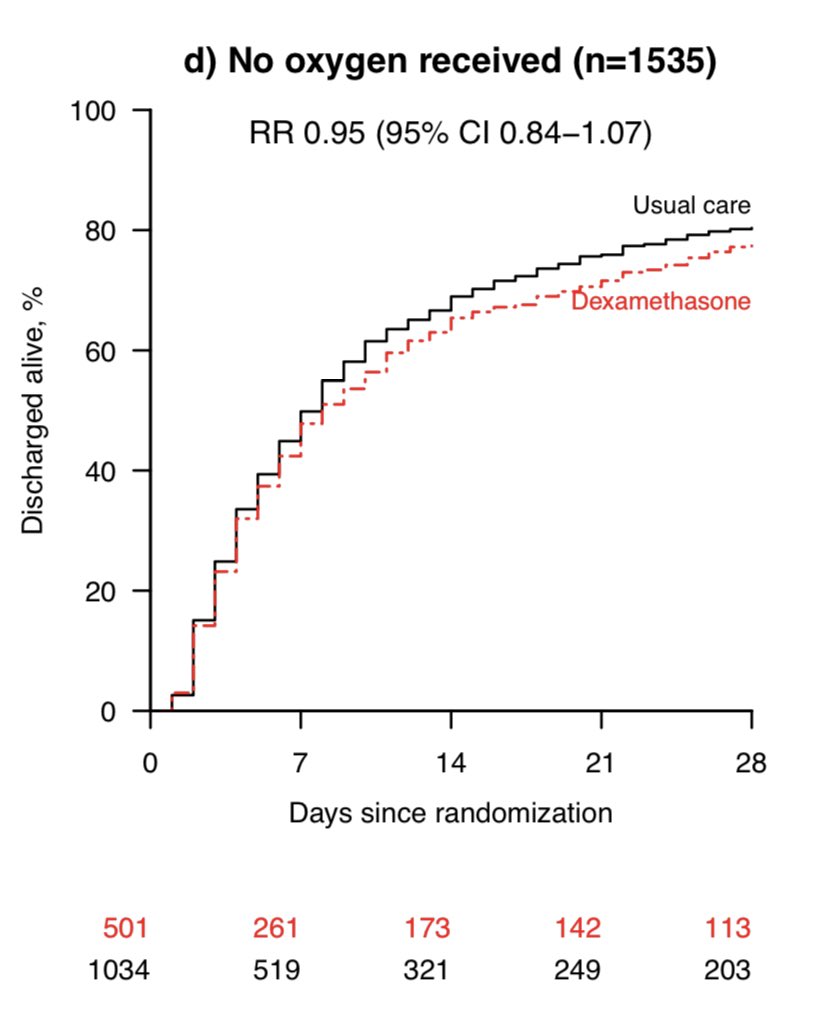 They also found a HARM signal among people NOT on supplemental Oxygen. That’s why we ONLY use Dex in inpatients on O2! nejm.org/doi/full/10.10…