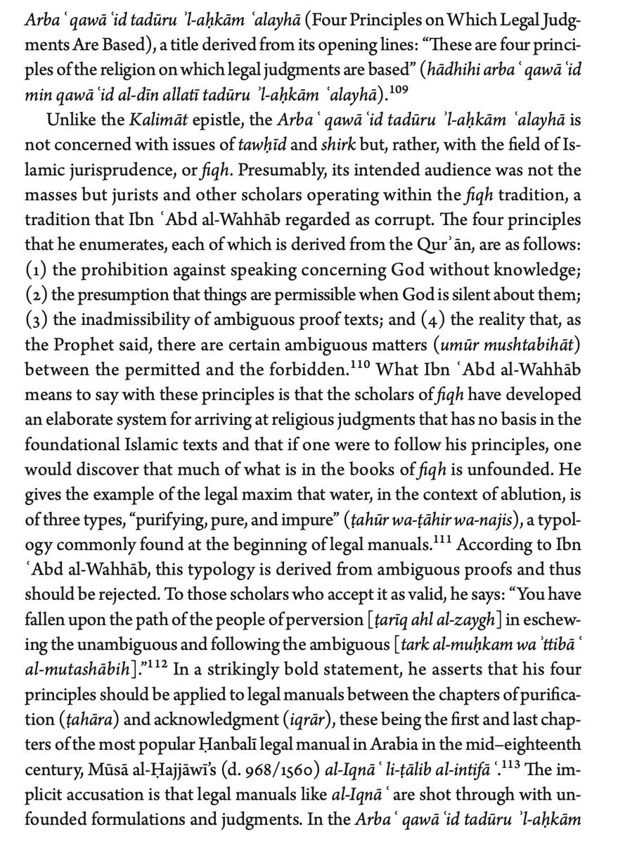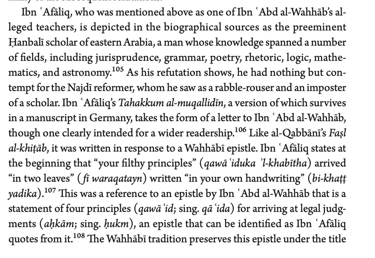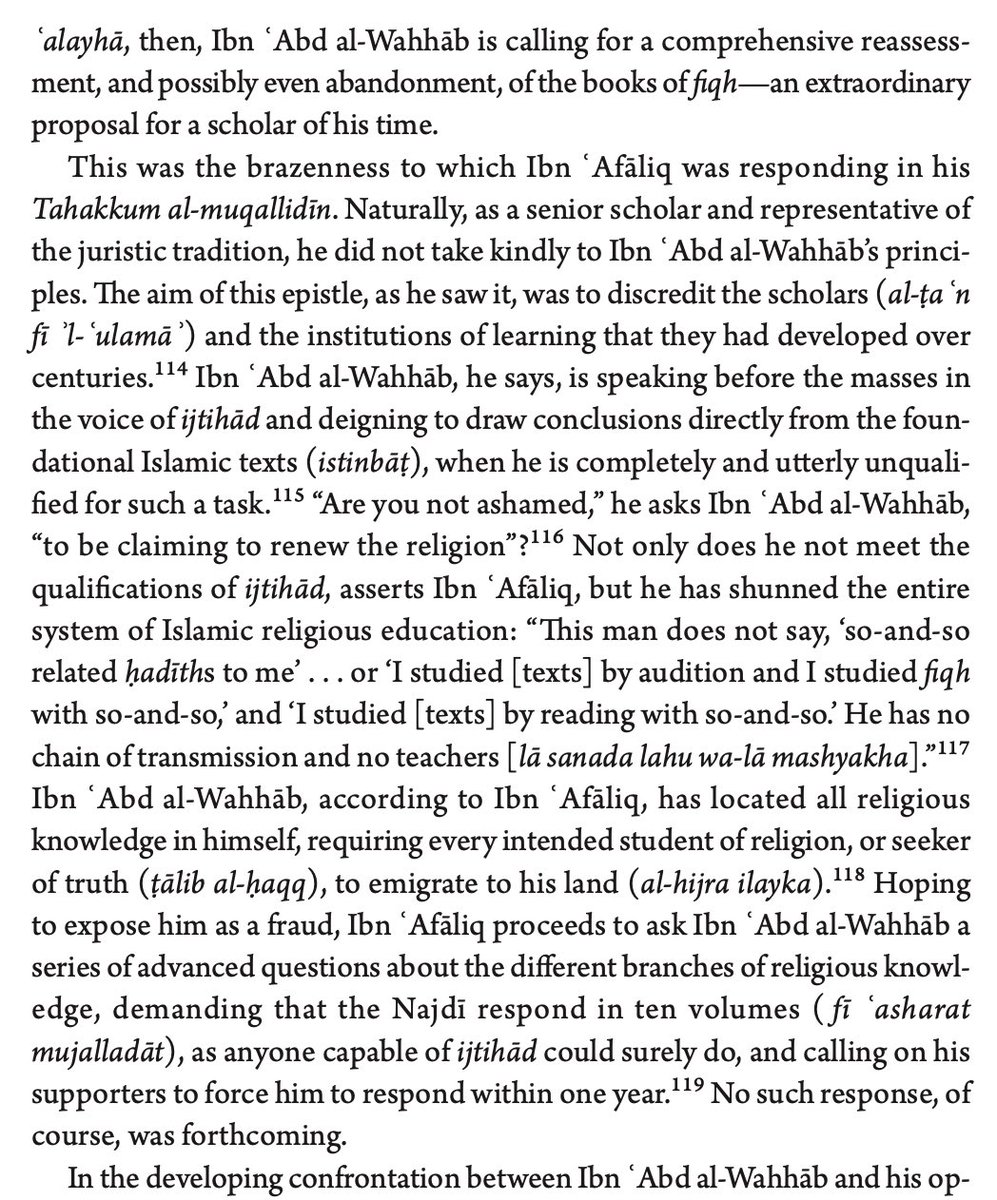 ‘Ibn ʿAbd al- Wahhāb, [Ibn Afaaliq] says, is speaking before the masses in the voice of ijtihād and deigning to draw conclusions directly from the foundational Islamic texts (istinbāṭ), when he is completely and utterly unqualified for such a task.’