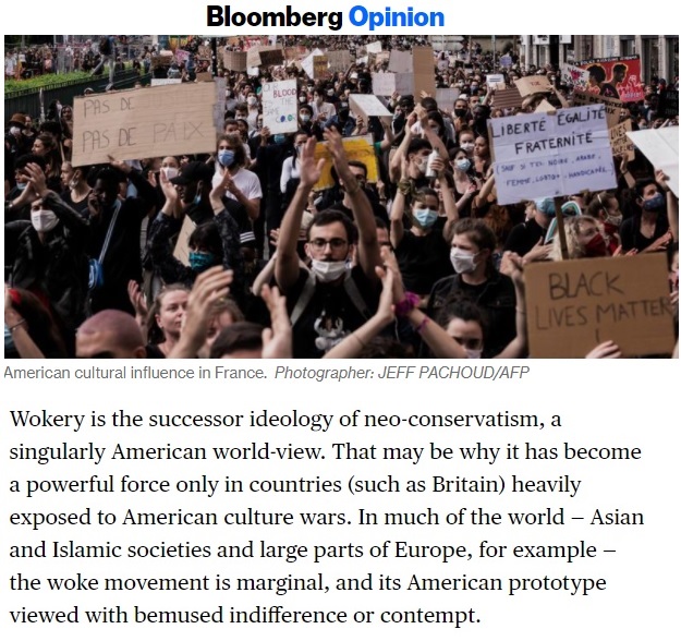 Em um artigo publicado em setembro de 2021 na agência de notícias do multibilionário Michael Bloomberg, o economista ultraliberal Tyler Cowen elogiou efusivamente o movimento "wokeísta" e o definiu como o próximo grande produto de exportação cultural dos Estados Unidos.