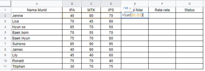 Misal, =SUM (B2:D2)