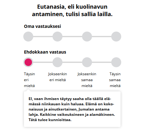 Vastustan eutanasiaa, koska ihmisen täytyy saaha olla elossa just niin kauan kuin haluaa. (KD, P-Savo)