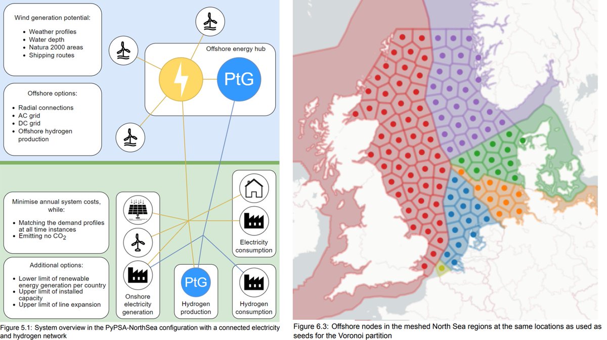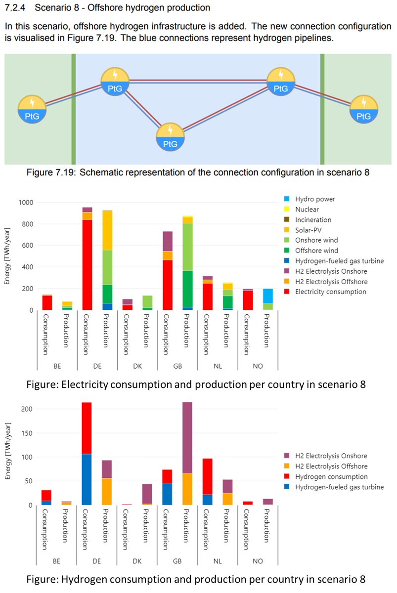 The most relevant scenario is #8, with a meshed offshore HVDC grid and offshore hydrogen production that supplies industry in the 🇳🇱&🇩🇪. A lot of onshore hydrogen production from 🏴&🏴 is exported via pipelines. Also 🇩🇰 exports both power and hydrogen ⚡️🫧. (2/4)