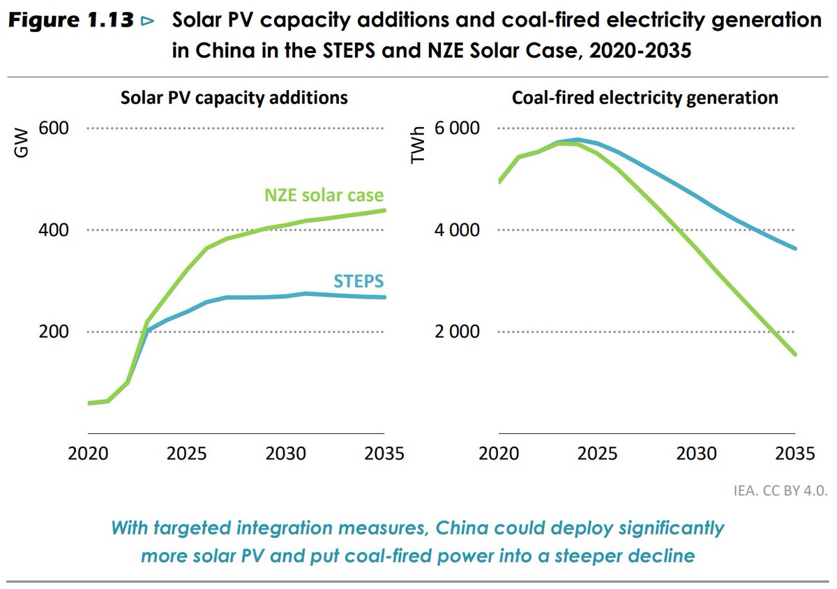 Arguments for why NZE is more likely than STEPS are presented by IEA themselves: "China could accelerate solar PV deployment to shift away from coal faster". I suggest changing "could" into "will", just because PV is more economical than coal. 🇨🇳 (3)