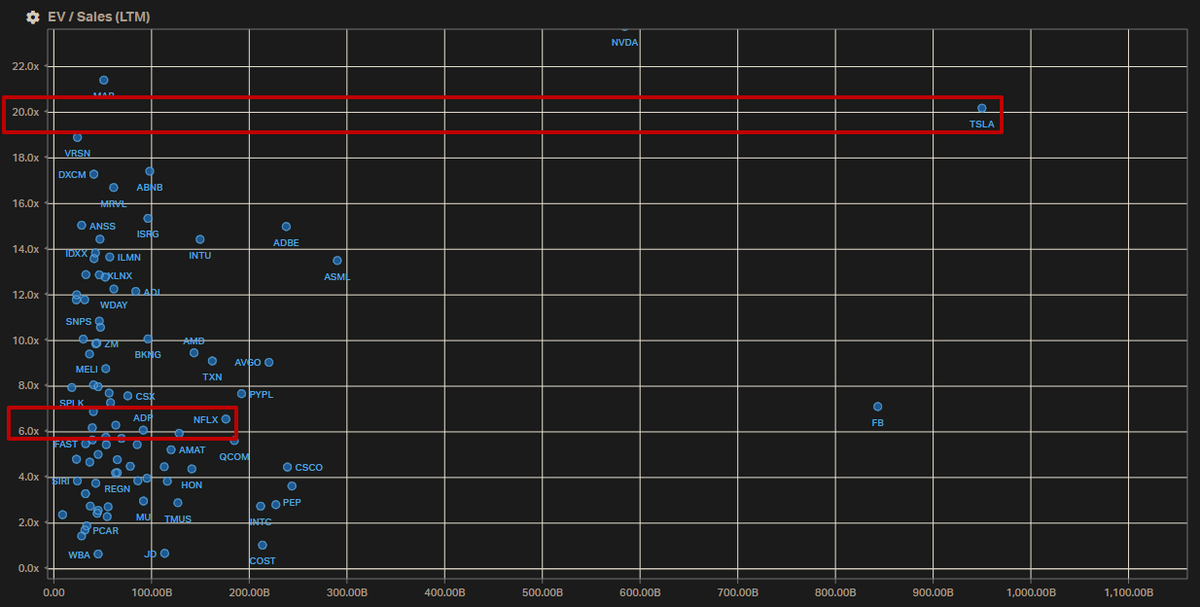 이 차트에서 보이는 EV/Sales만을 보면 같은 성장주에 속하는 테슬라는 훨씬 높은 시총을 가지고 있음에도 불구하고 20이 넘어가는 수치를 보이는 반면 넷플릭스는 더 작은 시총에도 불구하고 6을 겨우 넘기고 있습니다.