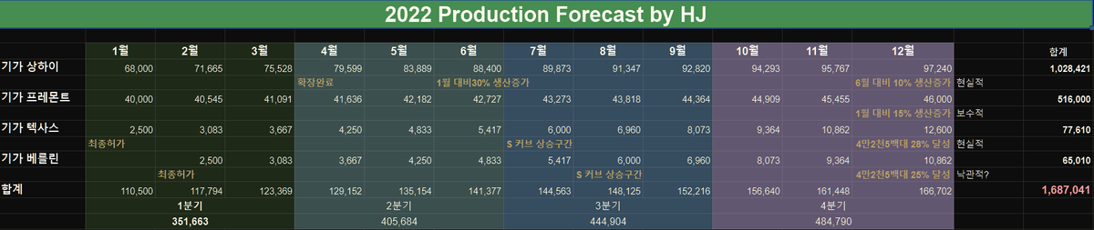 너무나 당연히 2022년도에도 테슬라의 생산량은 지속적으로 올라가게 될 것이며 아래 테이블과 차트가 제가 예상하는 2022년도 생산량입니다.