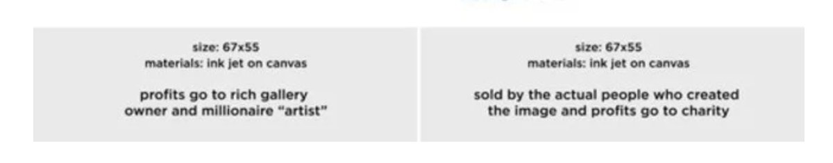 Pour lutter contre ça les artistes volés avaient vendu leur travail sur exactement les mêmes support & taille à 90$ pour essayer de casser la valeur & être rémunérés, mais beaucoup de gens voulaient une œuvre de Richard Prince (même prêt à payer cher) pas des artistes originaux
