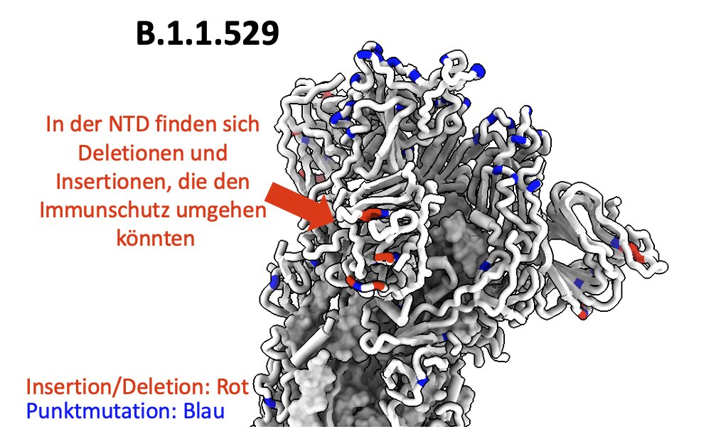 Schauen wir die Mutationen im Spike Protein von B.1.1.529 genauer an. Punktmutationen blau, Deletionen oder die Insertion von 3 Aminosäuren in Rot. Die Furin-Schnittstelle hat 2 Mutationen, NTD und RBD viele.