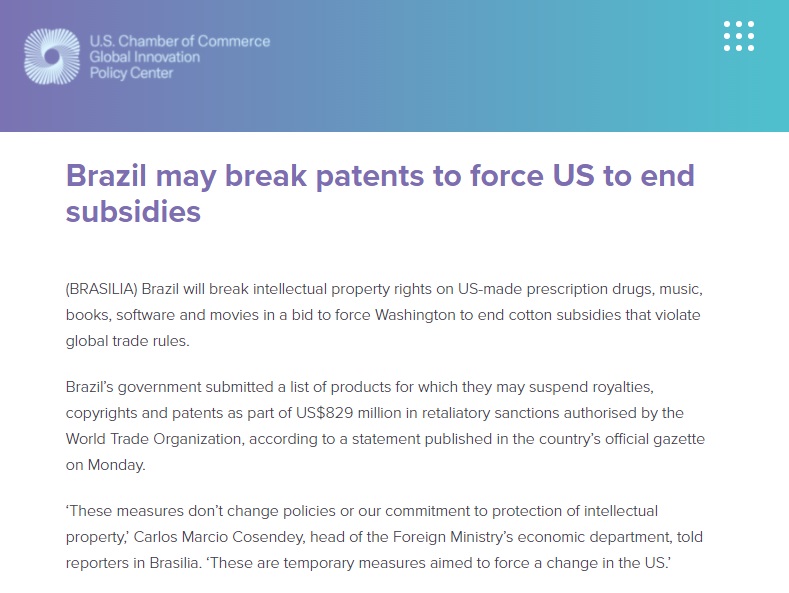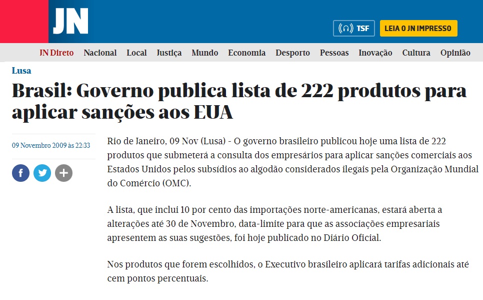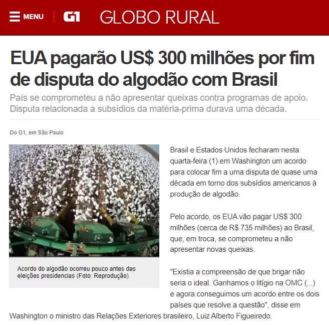 O governo brasileiro recorreu à Organização Mundial do Comércio (OMC) alegando que os EUA haviam fornecido mais de 12 bilhões de dólares em subsídios irregulares aos produtores de algodão, mantendo o preço artificialmente baixo e prejudicando os países periféricos.