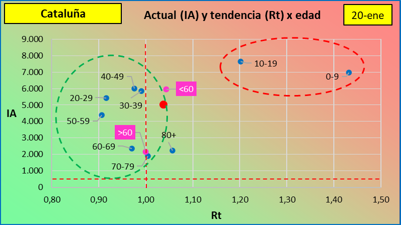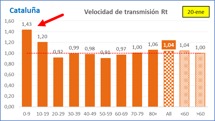 Mirando la tendencia más de cerca, Rt supera 1,2/1,4 en niños (5%-15% de aumento diario) mientras es estable o decreciente (Rt<1) en los demás 5/9