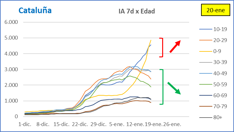 Las curvas de incidencia a 7 días muestran claramente que la ola ha pasado el pico en todas las edades salvo en los niños 4/9