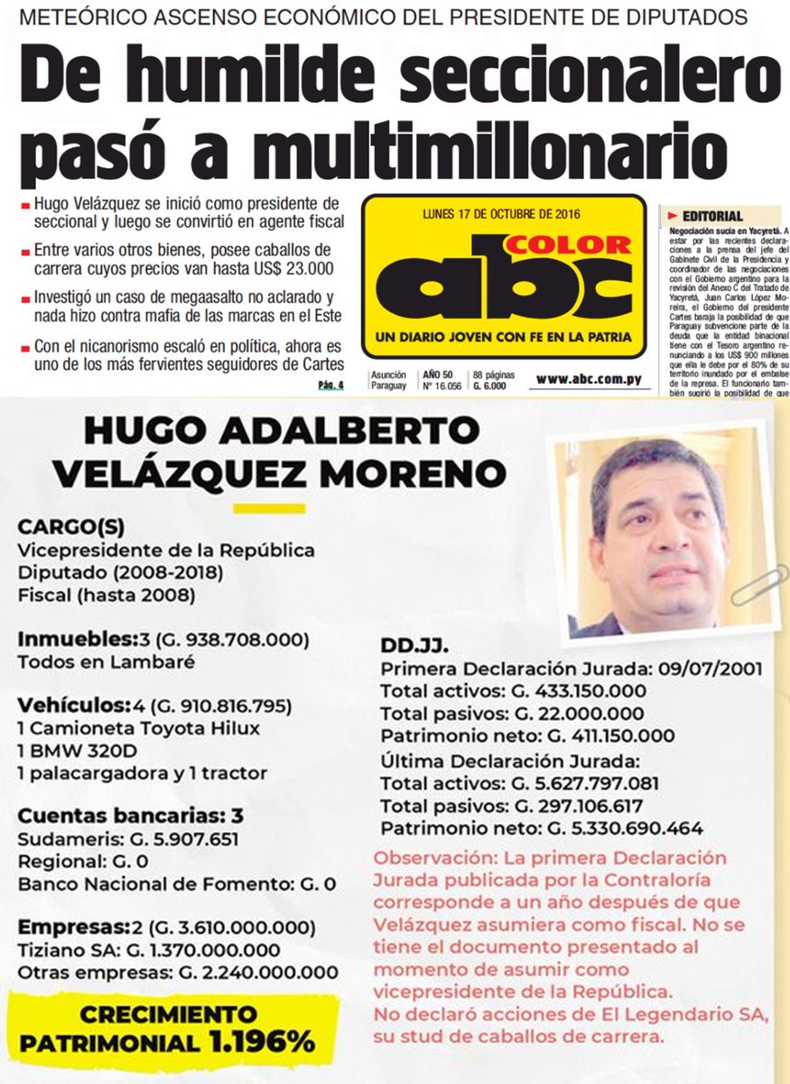 Para 2016, con 20 años en la función pública, Velázquez se había convertido ya en todo un potentado,dueño de numerosas propiedades y hasta de un stud de caballos de raza ubicado en las inmediaciones del Jockey Club de Asunción.
