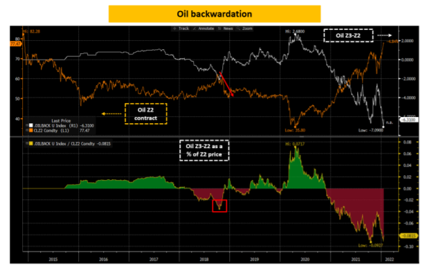Although a 10%+ backwardation sends stronger statistical signals re the evolution of spot price, the backwardation in the Dec23-Dec22 oil curve ($6 or 8% of the Dec22 implied price) anticipated a decent correction during a similar macro environment (mid-to-late 2018).