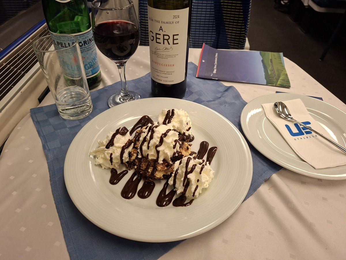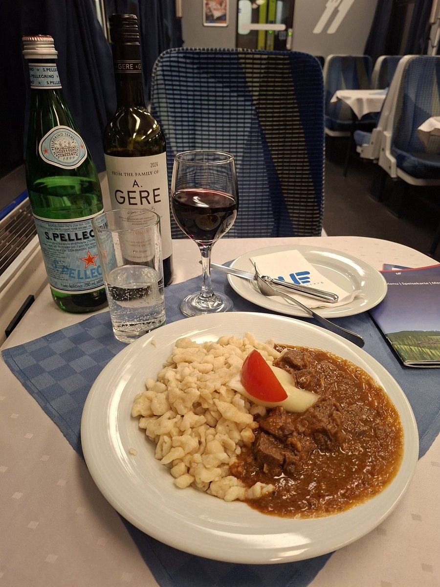 This train has an excellent Hungarian dining car, so I took the opportunity to enjoy the marhapörkölt galuskával (beef stew with dumplings) and the Somlói galuska (Sponge cake Somló style). With a bottle of Hungarian red, of course.