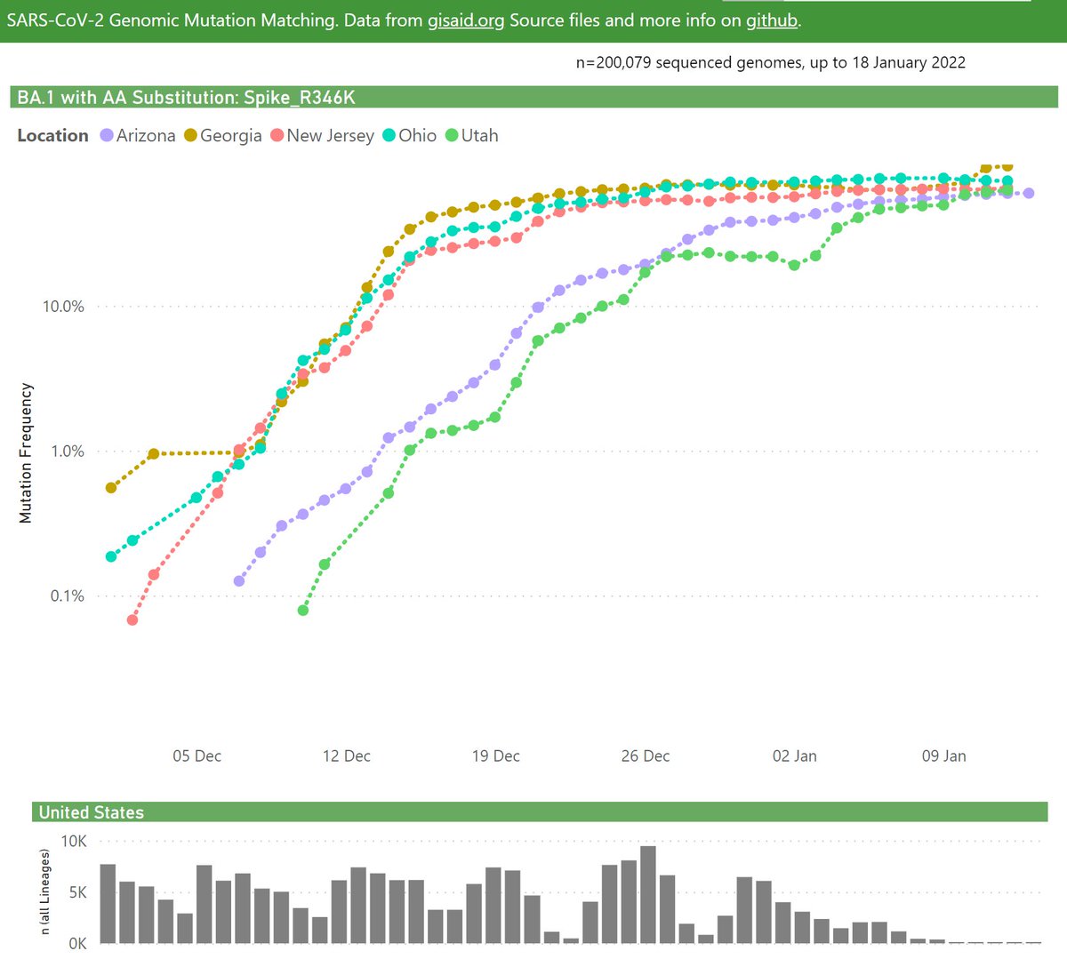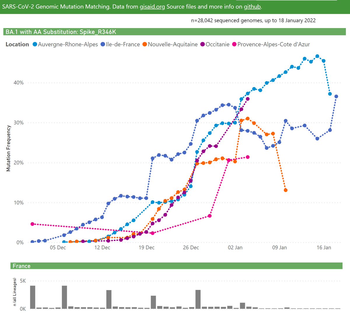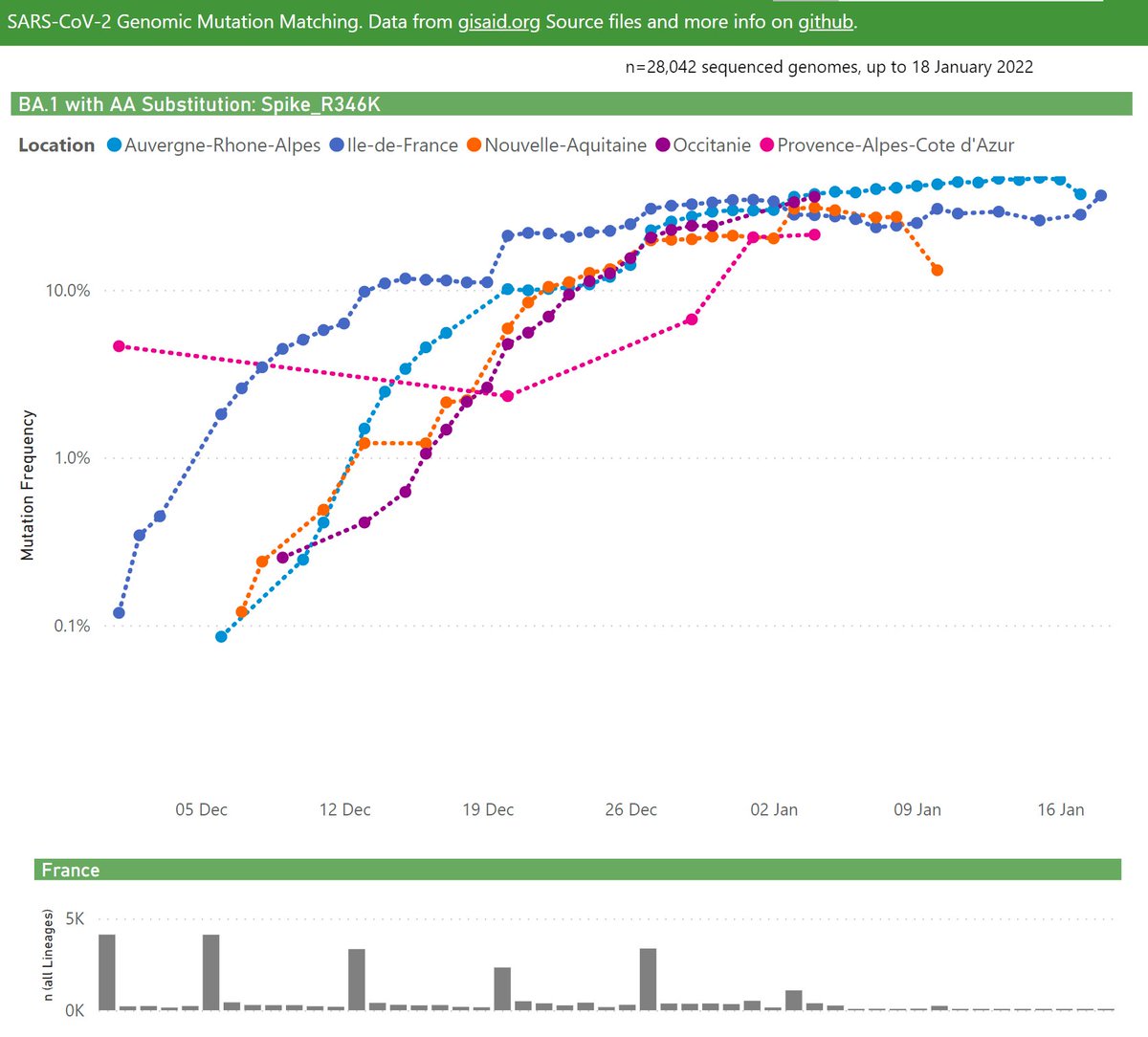 In the United Kingdom, the frequency of BA.1 with the Spike R346K mutation has been steadily growing, recently at ~25% (of all BA.1 samples).