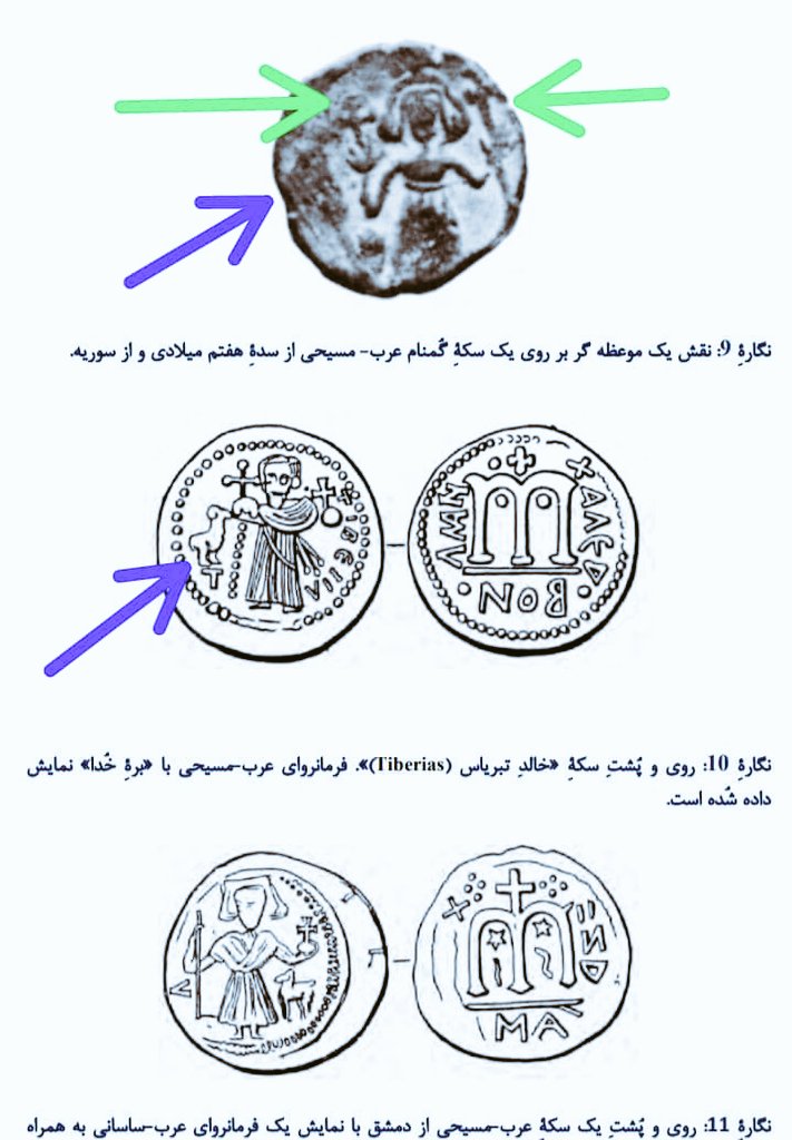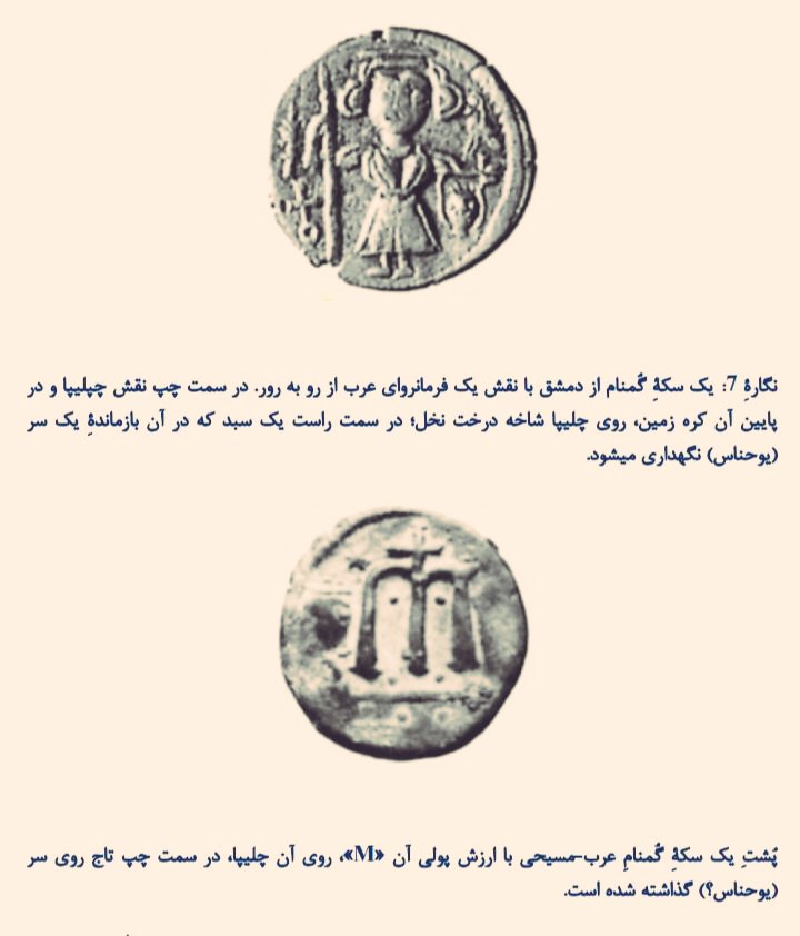 معاویه کتیبه شهر قدره را بجای انکه با نام خدا یا عبارتی دینی اغاز کند، با صلیب اغاز میکند. او در سکه های بخش غربی نیز نمادها و اِلمان های مسیحیت را میگنجاند. چنانچه گفتیم معاویه خود را مشغول به حفظ و نگهداری زیارتگاهی مقدس کرده بود که سر #یحیی_تعمیددهنده در ان نگهداری میشد، 👇