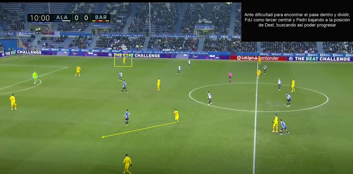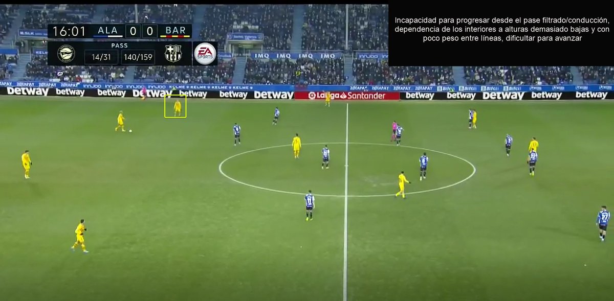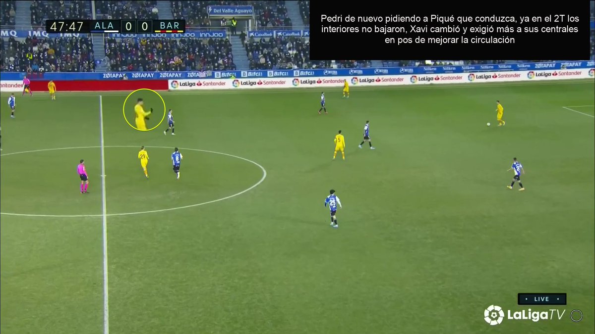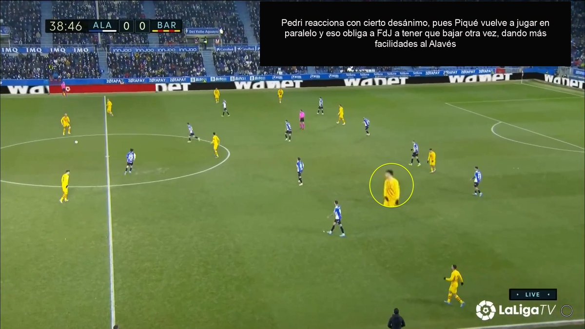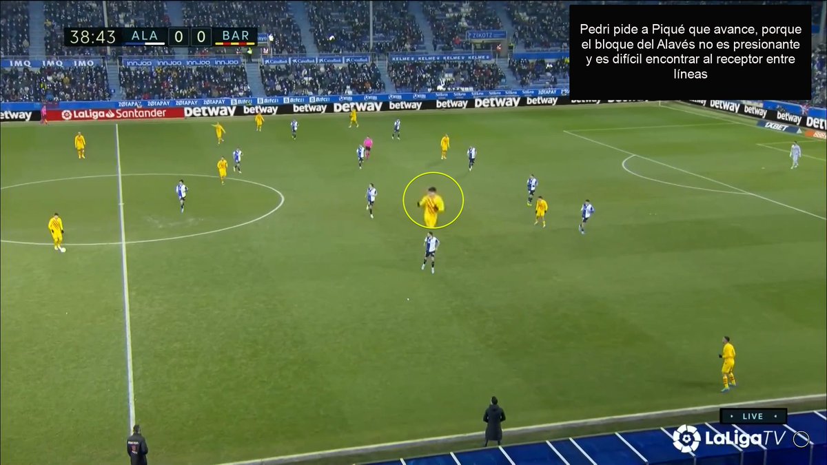 Fijaros en esta cómo Pedri precisamente le pide a Piqué que avance, pues el bloque del Alavés impide que los interiores reciban dentro.