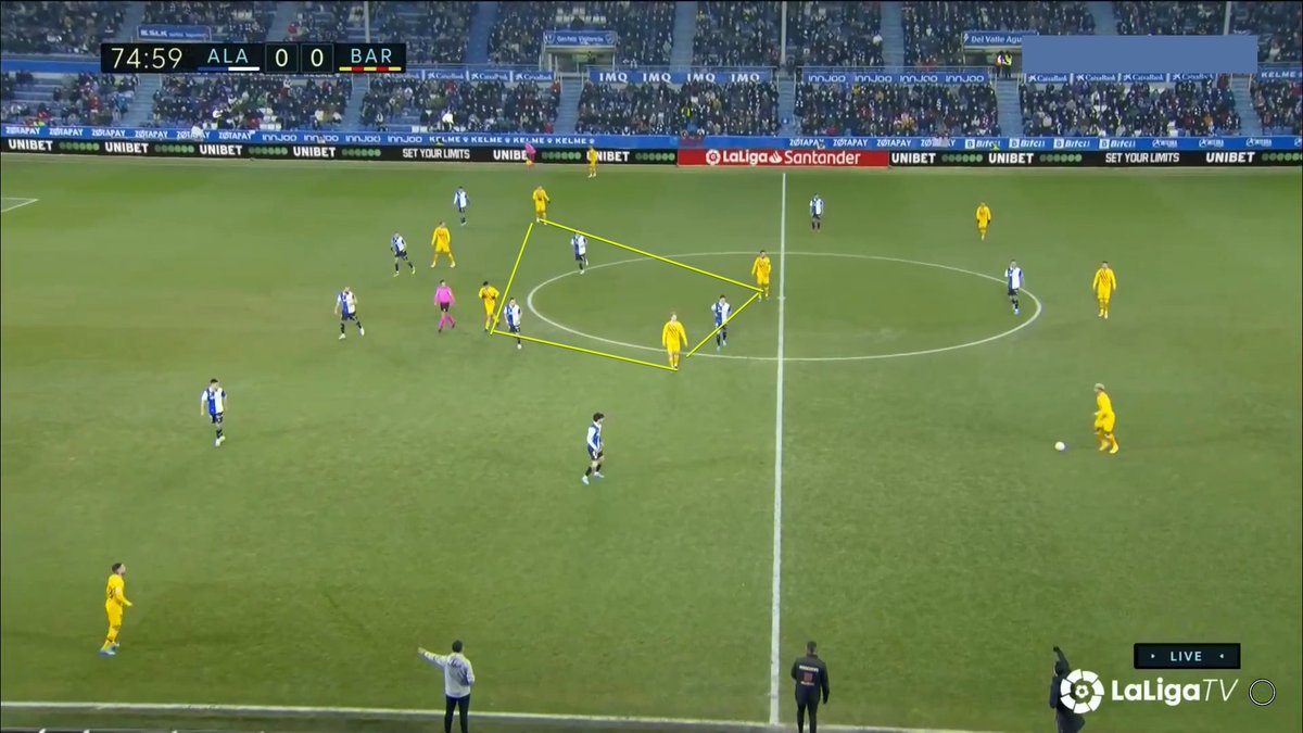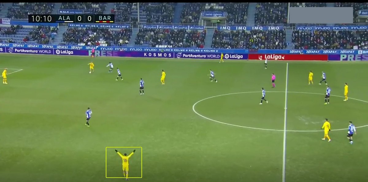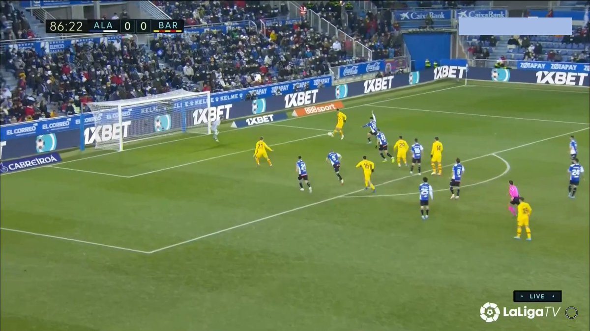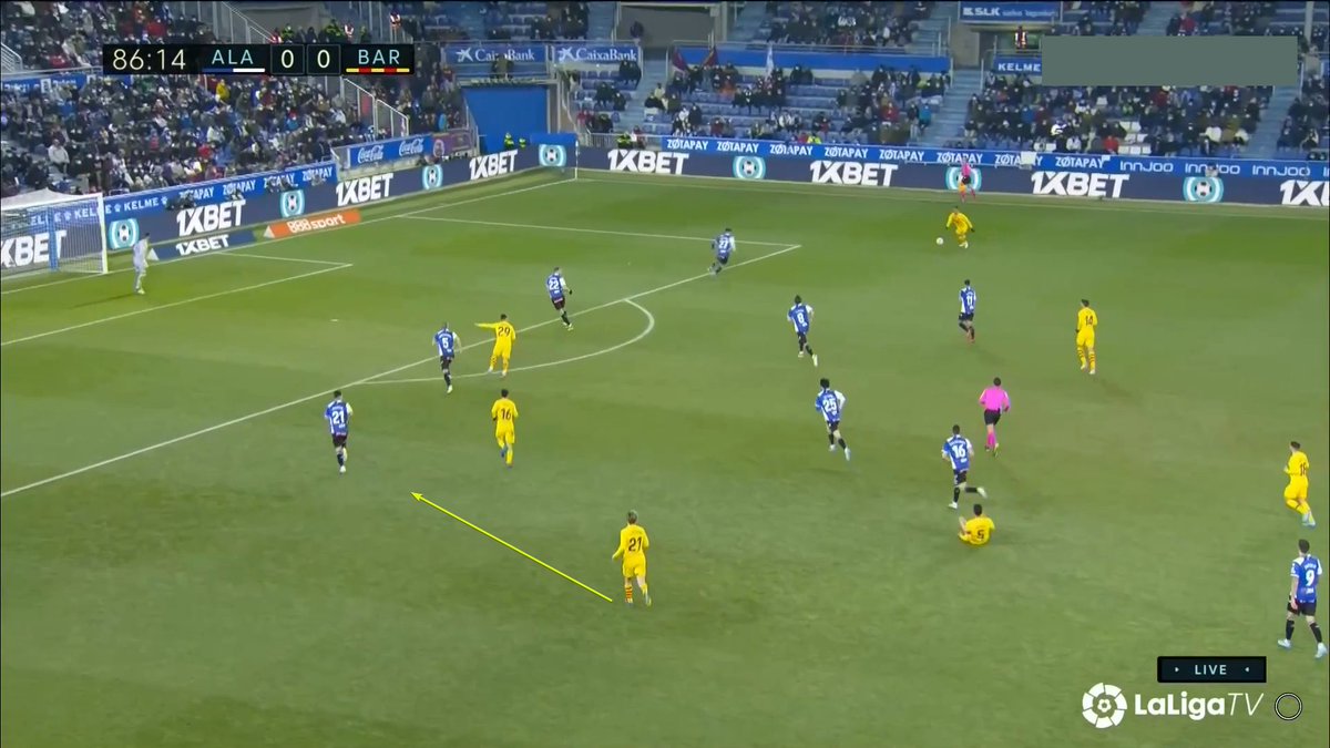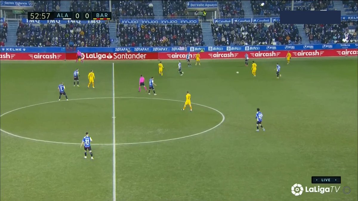 Fijaros en esta cómo Pedri precisamente le pide a Piqué que avance, pues el bloque del Alavés impide que los interiores reciban dentro.