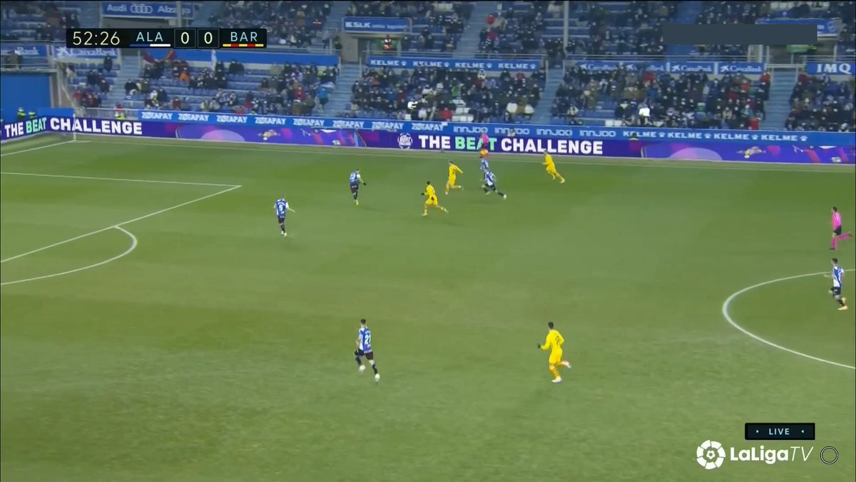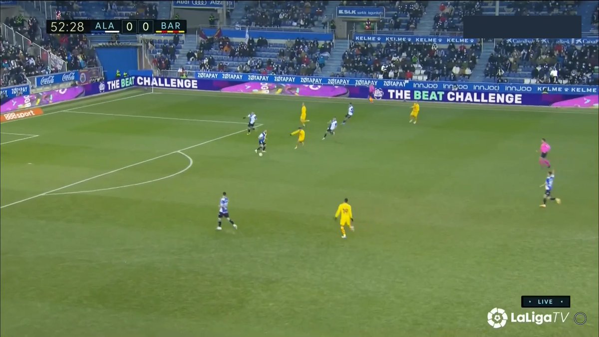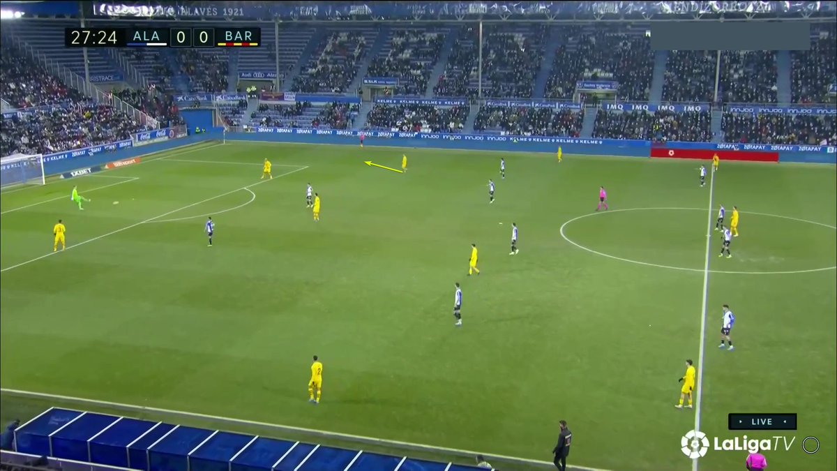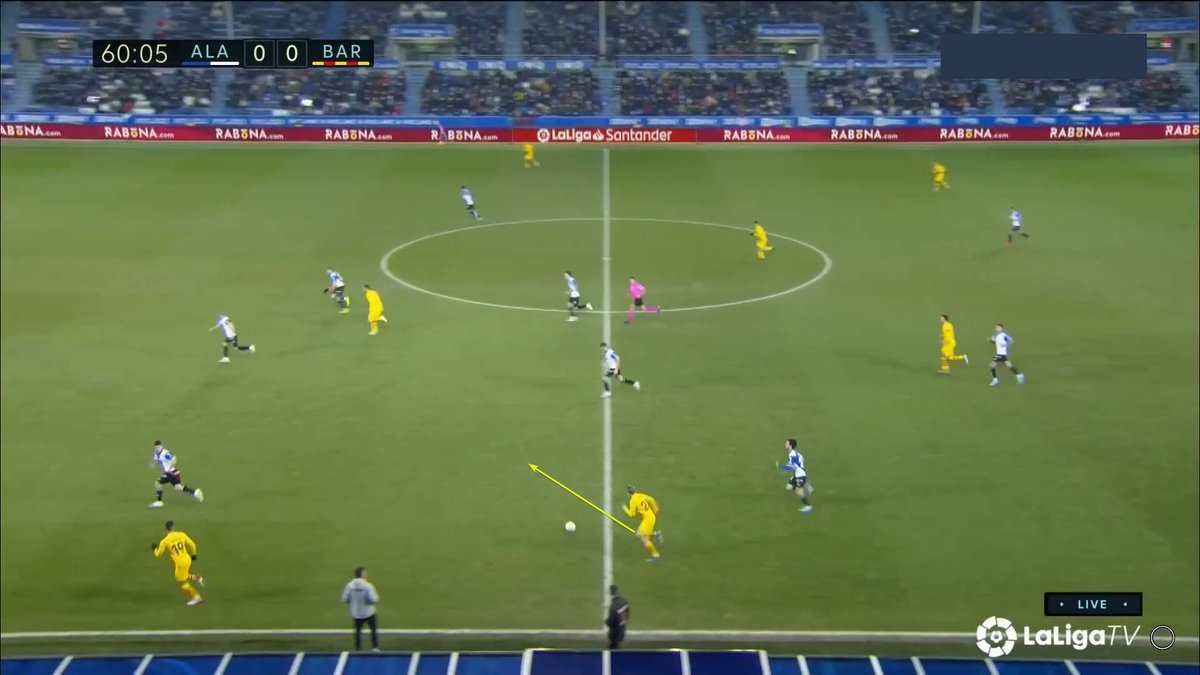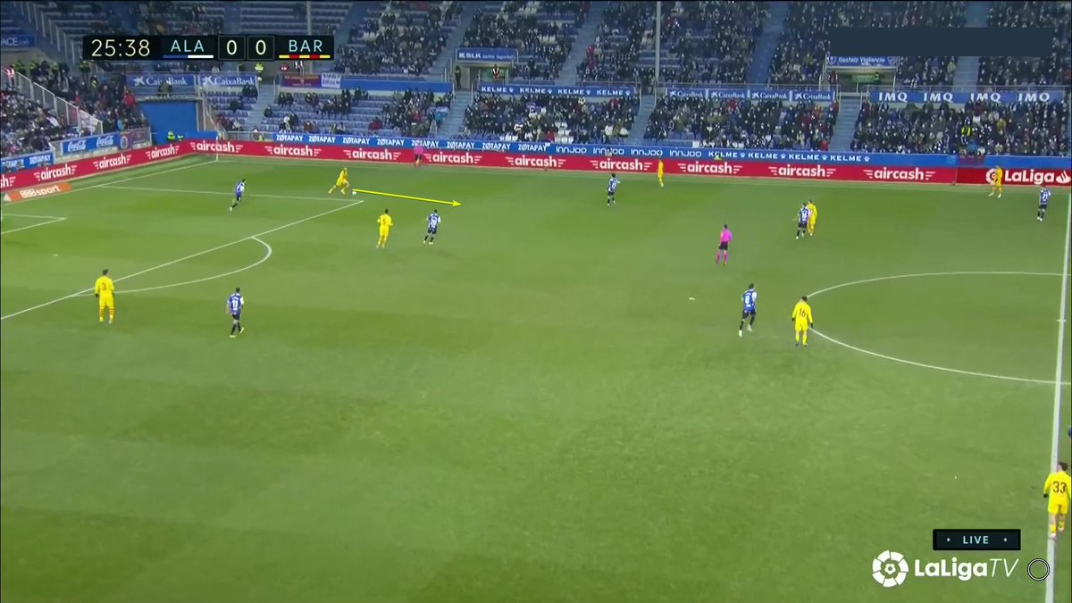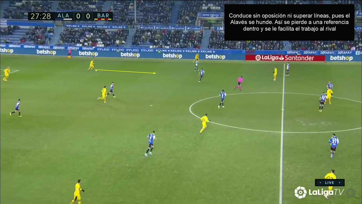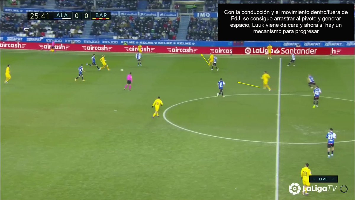 La única vez en todo el 1T que un central se animó a conducir y obligar al Alavés a reajustar, se originó una situación clara de superioridad en carril central, con el apoyo de Luuk y la aparición de Pedri como 3r hombre.