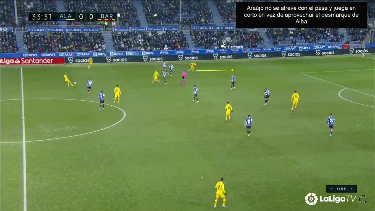 Otra situación clara de avance con pase marcado para el buen desmarque de Alba que Araújo no se atreve a dar y juega hacia el costado. Esto es confianza. Cuando la haya, el juego fluirá.