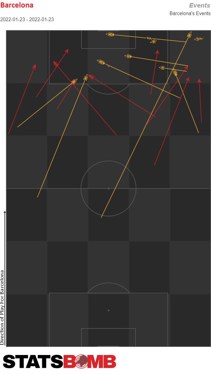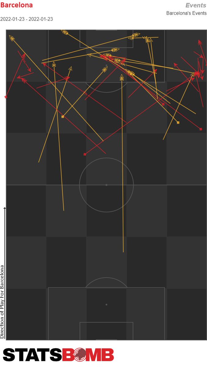 Este es el mapa de pases del Barça ante el Chelsea en el 1T. Se jugó en campo propio. Incapacidad para tener la pelota en campo rival (solo 13 progresiones al último tercio) y de transformar las salidas en ventajas.