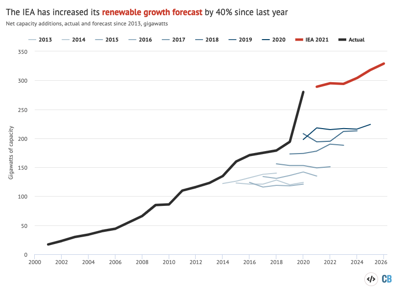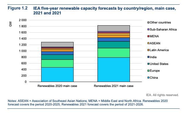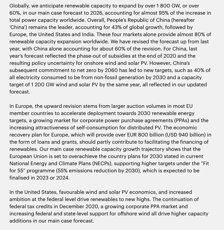 The massive boost in near-term renewable prospects is shown in IEA figure 1.2, with growth over the next 5yrs topping 1,800GW vs the 5yr forecast of 1,300GW last year (chart shld say "2020 and 2021")