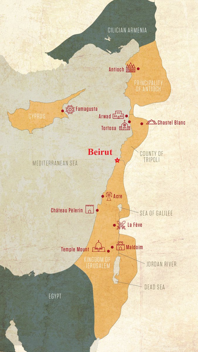 Beirut stands on a broad triangular promontory, which in Saladin’s time was covered with fields and orchards. The medieval city stood on its northern edge and was endowed with one of the finest harbors in the Levant.