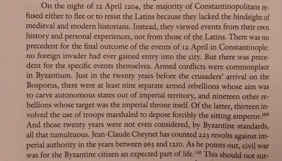 What explains the utter collapse of Constantinople's defense on the night of 12 April 1204? Queller and Madden argue that the dizzying succession of coups in the previous 21 years had basically trained the populace to be apathetic.