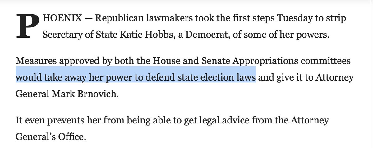 What's happening in the AZ legislature & w/ state electors is perilous. If Dems lose the battles for the SoS position &/or the governorship, it's not hyperbolic to posit that the state may be lost to our democracy.