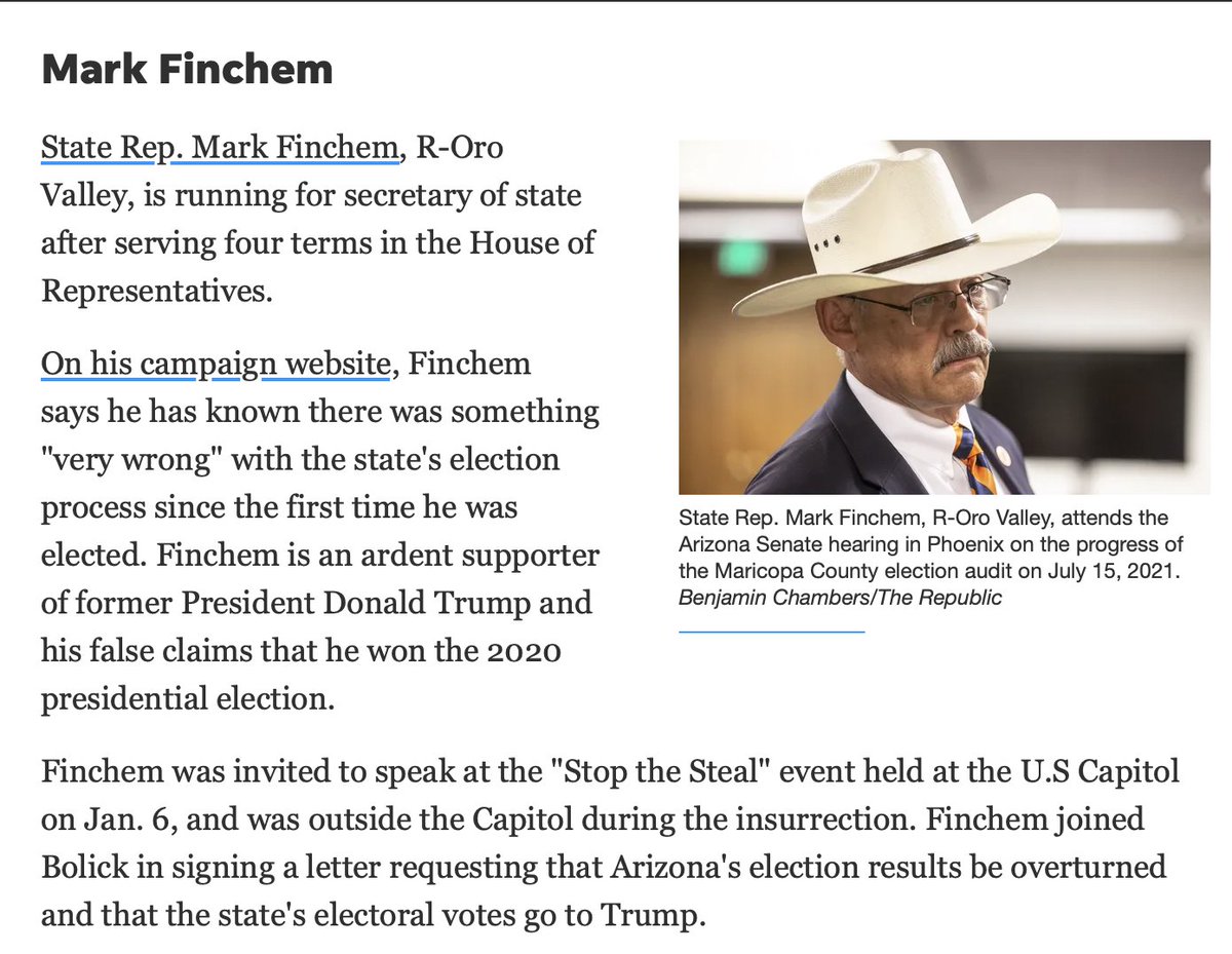 Now, in AZ and other states, Trump loyalists are being installed in state electoral positions. The AZ SoS seat is also on the ballot. One GOP candidate, Mark Finchem, is a member of the Oath Keepers & argued Arizona's votes should be given to Trump.
