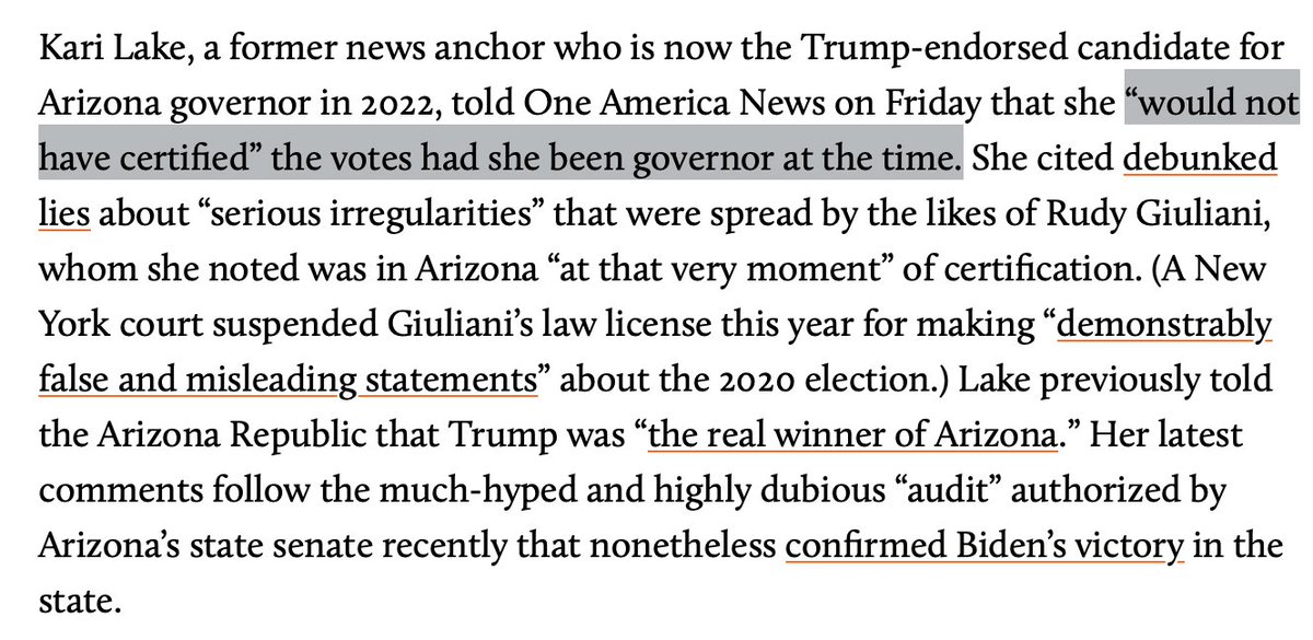 The AZ governorship is also on the ballot in 2022. Kari Lake has been endorsed by Trump and allies. Lake has argued for imprisoning the current Dem SoS, as well as journalists who wrote about the 2020 election. Lake has said she would not have certified the electoral results.
