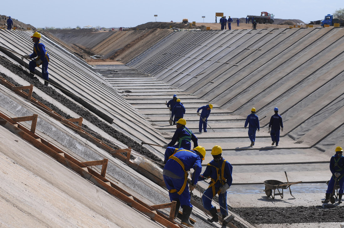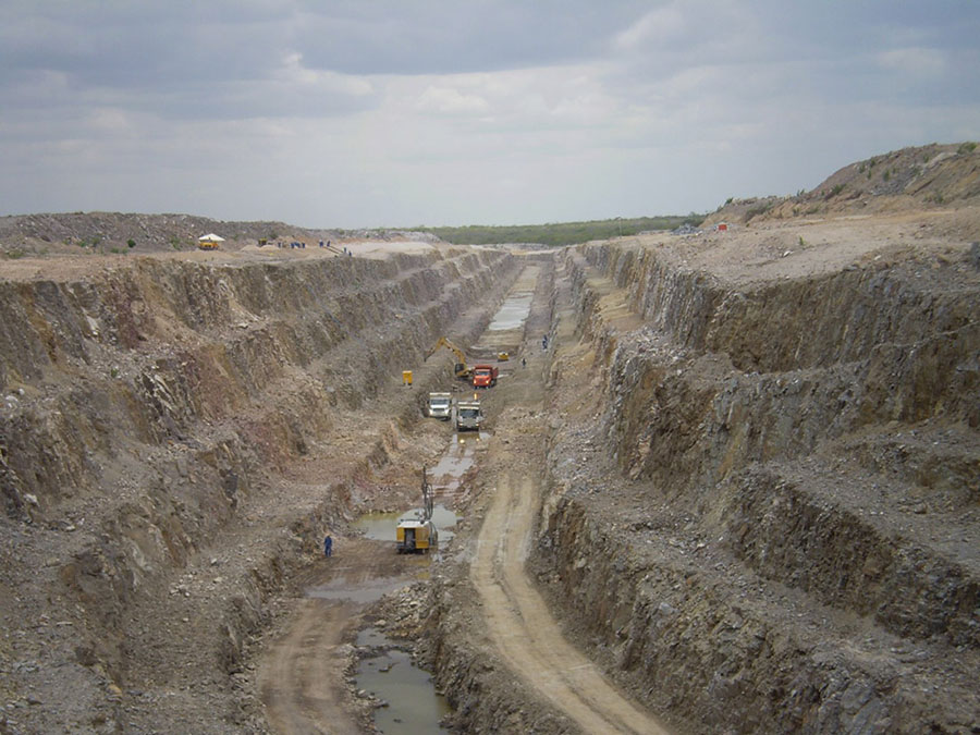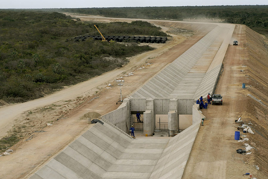 Um canal de irrigação com águas desviadas do Rio São Francisco cruza a mata seca da caatinga no semiárido nordestino. Iniciada em 2007, durante o segundo mandato de Lula, a Transposição do Rio São Francisco é uma das maiores obras de segurança hídrica da história.