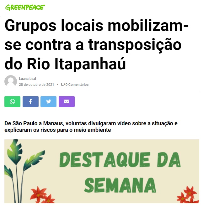 ONGs internacionais e brasileiras criticaram duramente o projeto, alegando existência de alto risco de deterioração dos biomas ao longo do Rio São Francisco. Greenpeace e WWF organizaram protestos e lançaram campanhas para engajar a população na luta contra a obra.