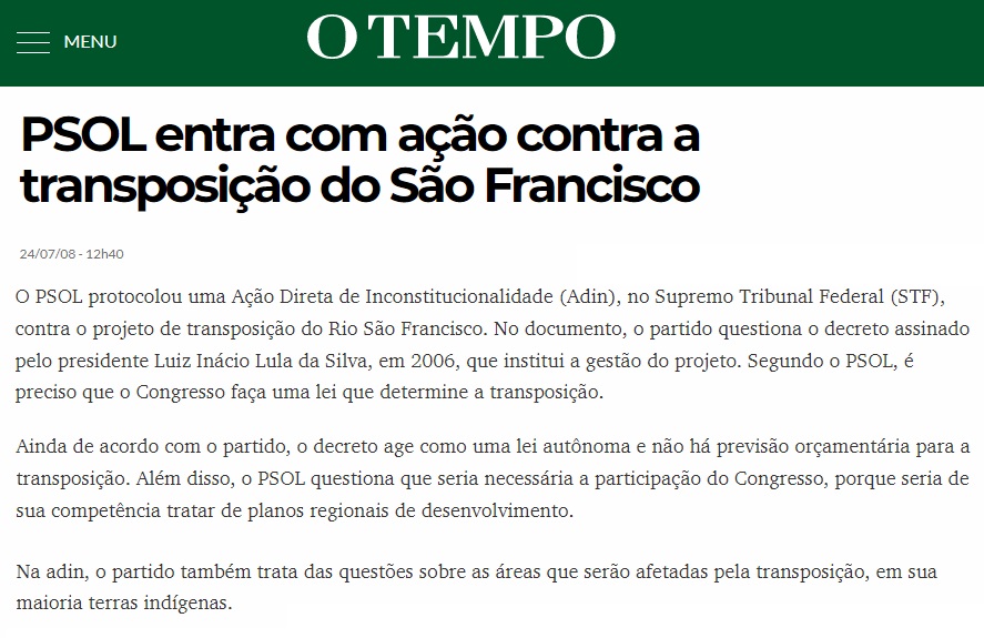 Além das ONGs e das instituições sob a esfera de influência de Washington, a transposição enfrentou ampla resistência de parte da esquerda brasileira. O PSOL chegou a protocolar uma Ação Direta de Inconstitucionalidade no STF para tentar barrar a obra.