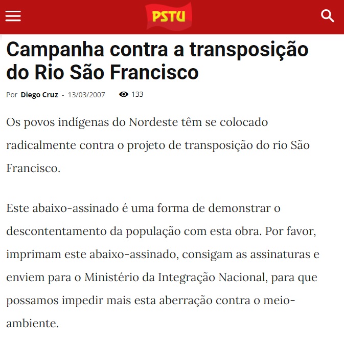 O PSTU lançou uma campanha contra a transposição, afirmando representar o interesse dos povos indígenas, comparando o governo petista com a ditadura militar e vaticinando que "é muito mais eficiente buscar conviver com o semiárido do que confrontá-lo".