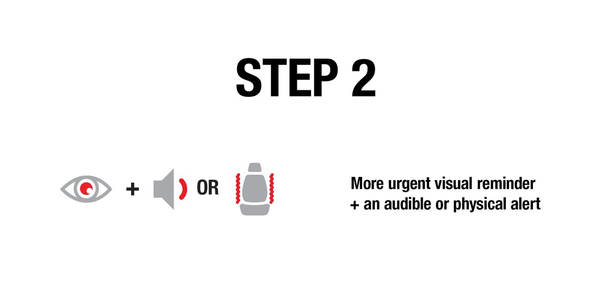 If the driver doesn't quickly respond, the system should rapidly add an audible or physical alert, such as seat vibration, and a more urgent visual message. 3/7