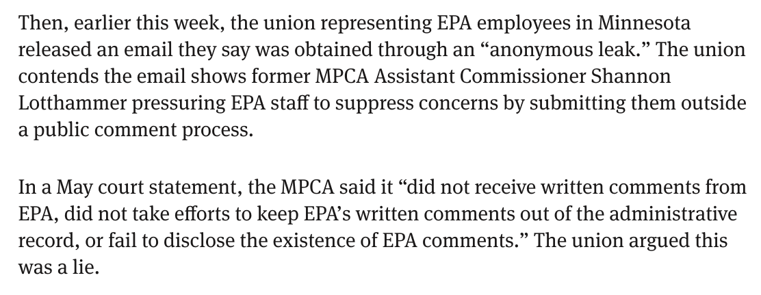 After telling a court that they never, ever asked the EPA to keep comments out of the record, a union whistleblower in the Chicago EPA office sent copies of emails from the MPCA proving MPCA was lying. (14/ minnpost.com/environment/20…