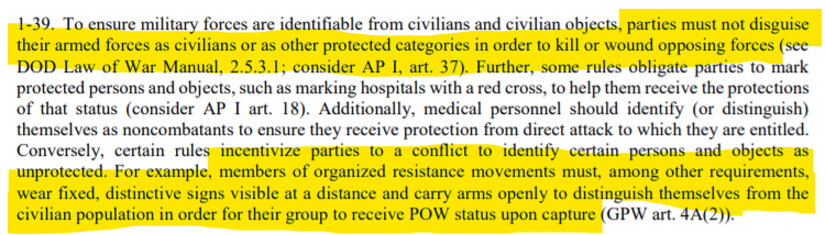 It's a basic element of of the international law of armed conflict that combatants bear the responsibility of "distinction" or "discrimination." It's their responsibility both to discriminate between military and civilian targets and to distinguish themselves from civilians. /2
